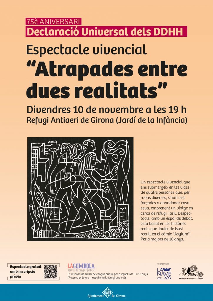 I milers de persones arreu del món no poden exercir els drets que recull la DUDH amb llibertat i garanties. Malgrat, la situació actual, l’àrea de cooperació de l’Ajuntament de Girona en xarxa amb el teixit social gironí, continuen treballant per la defensa i la promoció dels Drets Humans i juntament amb el Museu d’Història de Girona organitzen aquesta activitat, a l’espai de memòria del refugi antiaeri del jardí de la Infància. L’espectacle comptarà amb un espai de debat.